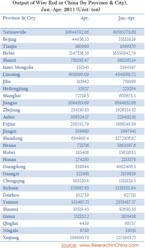 Output of Wire Rod in China (by Province & City), Jan.-Apr. 2011