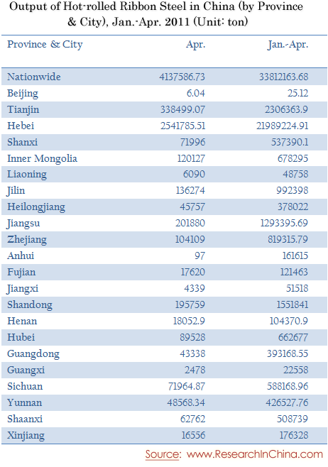 Output of Hot-rolled Ribbon Steel in China (by Province & City), Jan.-Apr. 2011