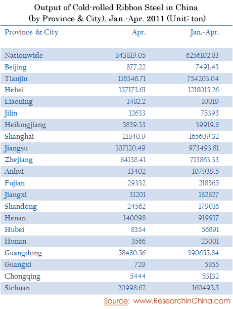 Output of Cold-rolled Ribbon Steel in China (by Province & City), Jan.-Apr. 2011