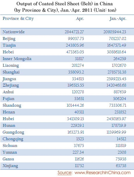 Output of Coated Steel Sheet (Belt) in China (by Province & City), Jan.-Apr. 2011