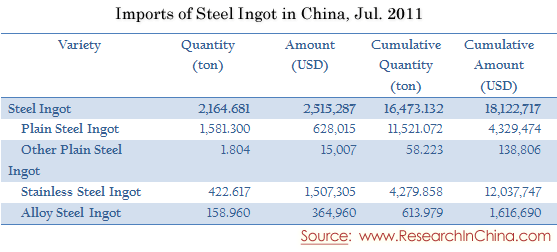 Imports of Steel Ingot in China, Jul. 2011