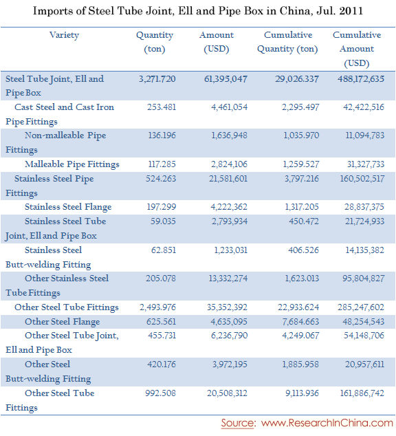 Imports of Steel Tube Joint, Ell and Pipe Box in China, Jul. 2011