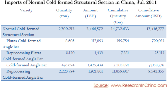 Imports of Normal Cold-formed Structural Section in China, Jul. 2011