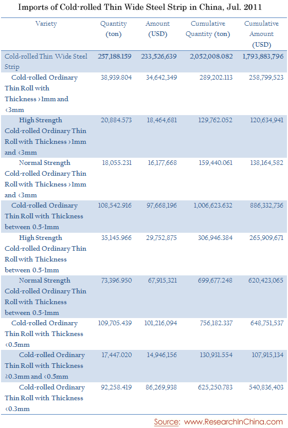 Imports of Cold-rolled Thin Wide Steel Strip in China, Jul. 2011