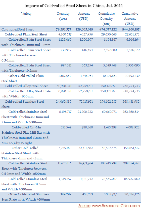 Imports of Cold-rolled Steel Sheet in China, Jul. 2011