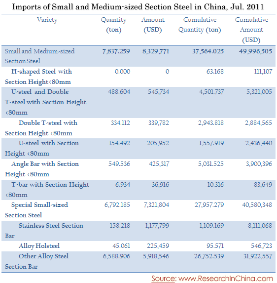 Imports of Small and Medium-sized Section Steel in China, Jul. 2011