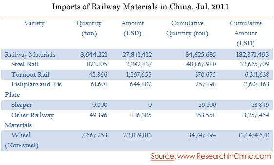 Imports of Railway Materials in China, Jul. 2011