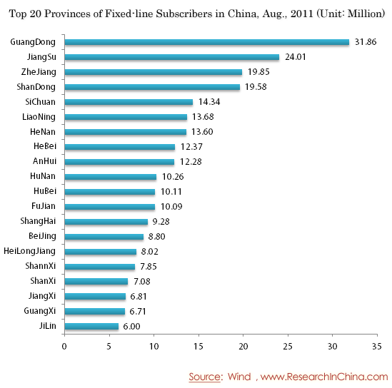 Top 20 Provinces of Fixed-line Subscribers in China, Aug., 2011