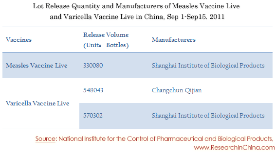 Lot Release Quantity and Manufacturers of Measles Vaccine Live and Varicella Vaccine Live in China, Sep 1-Sep15. 2011