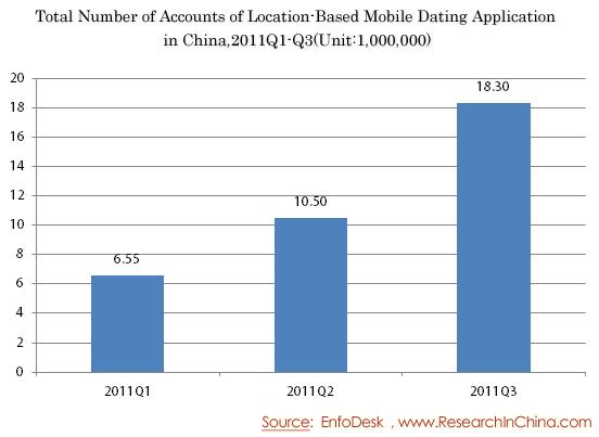 Total Number of Accounts of Location-Based Mobile Dating Application in China,2011Q1-Q3(Unit:1,000,000)