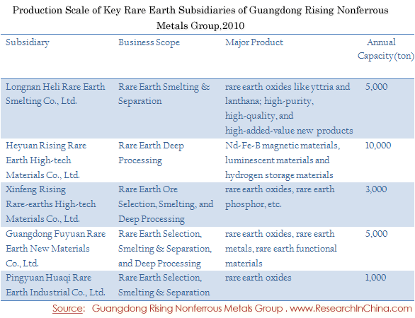 Production Scale of Key Rare Earth Subsidiaries of Guangdong Rising Nonferrous Metals Group,2010