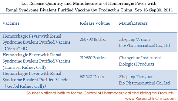 Lot Release Quantity and Manufacturers of Hemorrhagic Fever with Renal Syndrome Bivalent Purified Vaccine (by Product)in China, Sep 16-Sep30. 2011