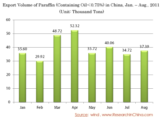 Export Volume of Paraffin (Containing Oil<0.75%) in China, Jan. – Aug., 2011