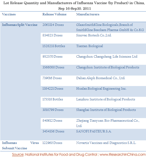Lot Release Quantity and Manufacturers of Influenza Vaccine (by Product) in China, Sep 16-Sep30. 2011