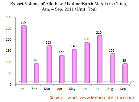 Export Volume of Alkali or Alkaline-Earth Metals in China, Jan. – Sep. 2011