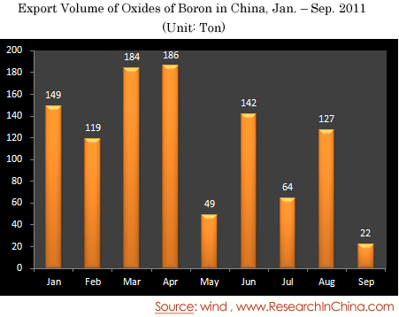 Export Volume of Oxides of Boron in China, Jan. – Sep. 2011