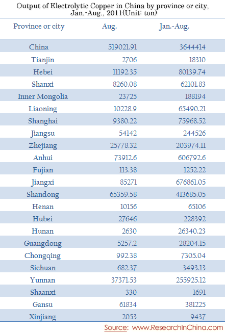 Output of Electrolytic Copper in China by province or city, Jan.-Aug., 2011