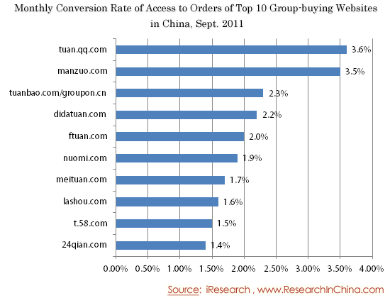 Monthly Conversion Rate of Access to Orders of Top 10 Group-buying Websites in China, Sept. 2011