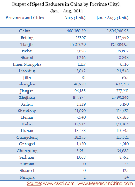 Output of Speed Reducers in China by Province (City), Jan. - Aug. 2011