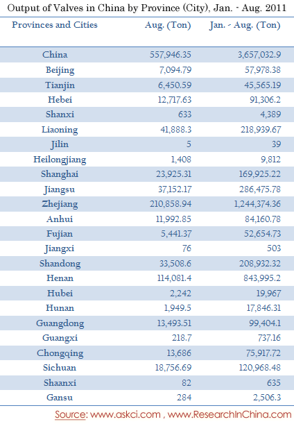 Output of Valves in China by Province (City), Jan. - Aug. 2011
