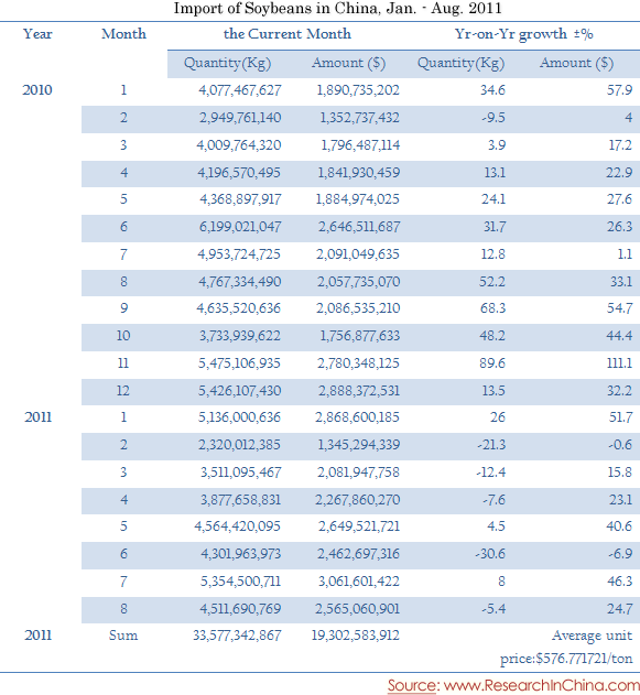 Import of Soybeans in China, Jan. - Aug. 2011