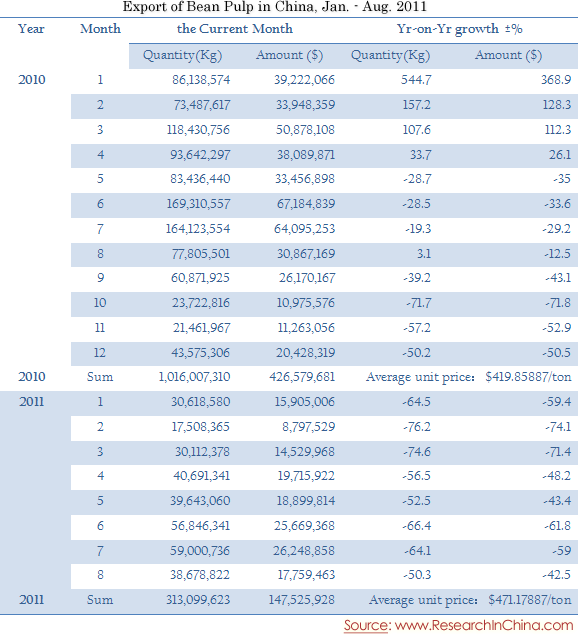 Export of Bean Pulp in China, Jan. - Aug. 2011