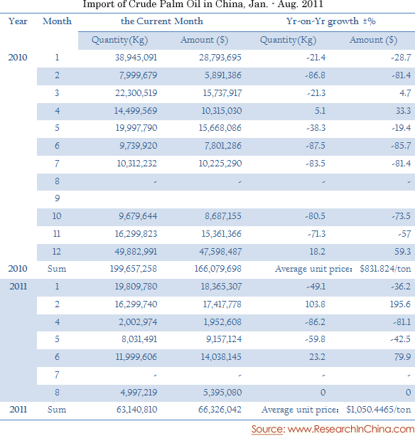 Import of Crude Palm Oil in China, Jan. - Aug. 2011
