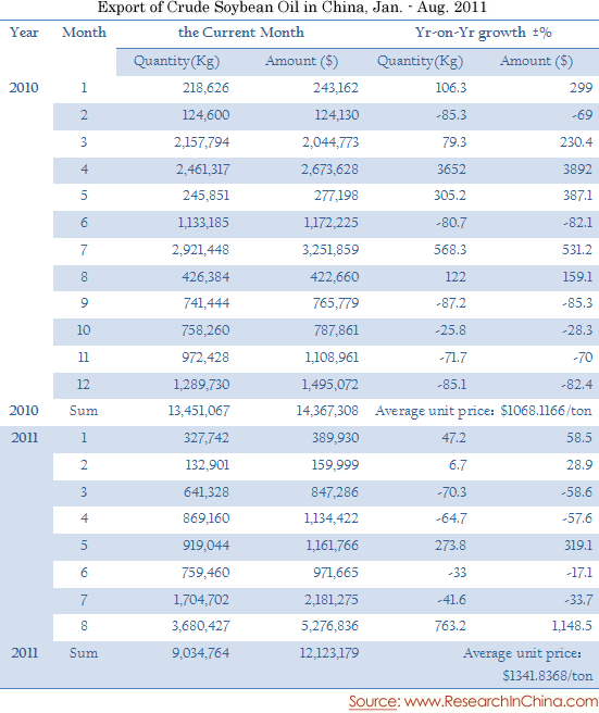 Export of Crude Soybean Oil in China, Jan. - Aug. 2011