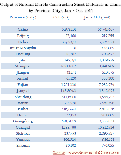 Output of Natural Marble Construction Sheet Materials in China by Province (City), Jan. - Oct. 2011