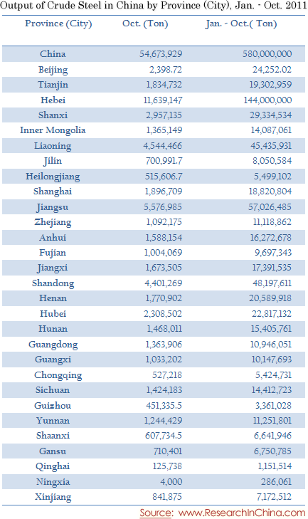 Output of Crude Steel in China by Province (City), Jan. - Oct. 2011