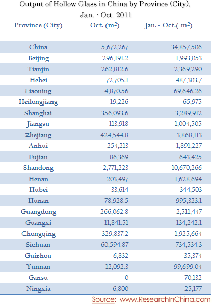 Output of Hollow Glass in China by Province (City), Jan. - Oct. 2011