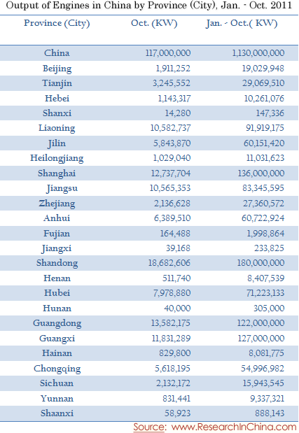 Output of Engines in China by Province (City), Jan. - Oct. 2011