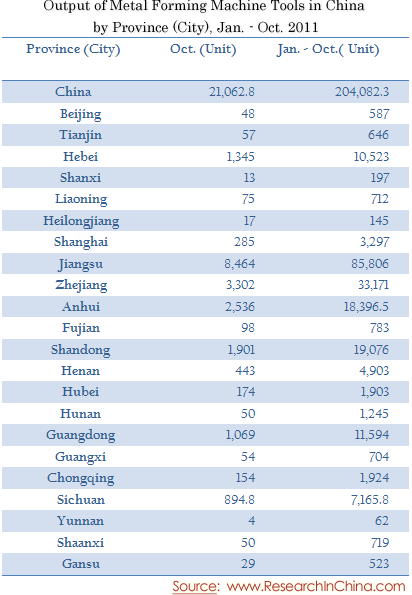 utput of Metal Forming Machine Tools in China by Province (City), Jan. - Oct. 2011