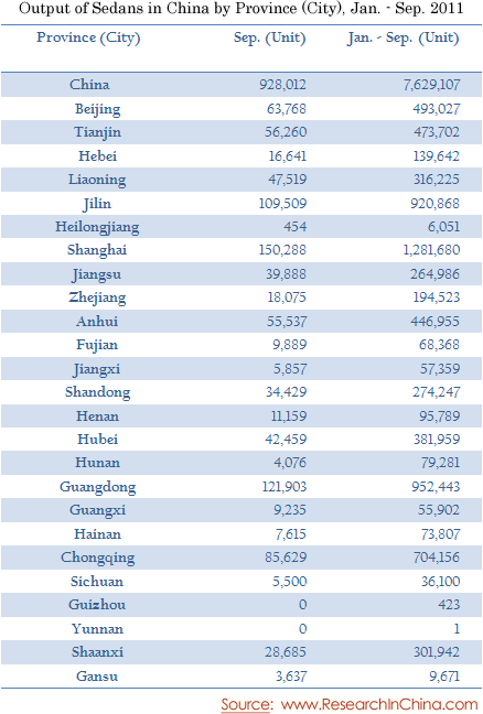 Output of Sedans in China by Province (City), Jan. - Sep. 2011