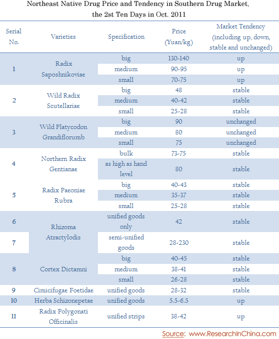 Northeast Native Drug Price and Tendency in Southern Drug Market, the 2st Ten Days in Oct. 2011