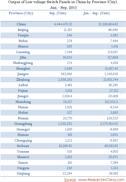 Output of Low-voltage Switch Panels in China by Province (City), Jan. - Sep. 2011