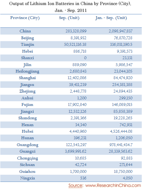 Output of Lithium Ion Batteries in China by Province (City), Jan. - Sep. 2011