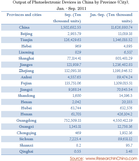 Output of Photoelectronic Devices in China by Province (City), Jan. - Sep. 2011
