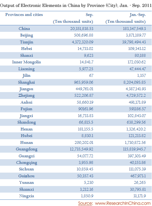 Output of Electronic Elements in China by Province (City), Jan. - Sep. 2011