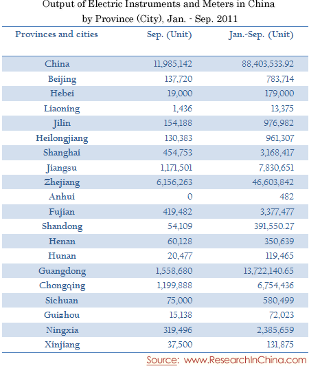 Output of Electric Instruments and Meters in China by Province (City), Jan. - Sep. 2011