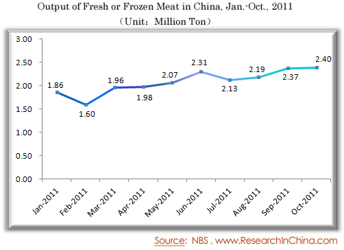 Output of Fresh or Frozen Meat in China, Jan.-Oct., 2011