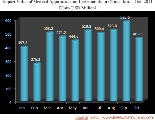 Import Value of Medical Apparatus and Instruments in China, Jan. – Oct. 2011