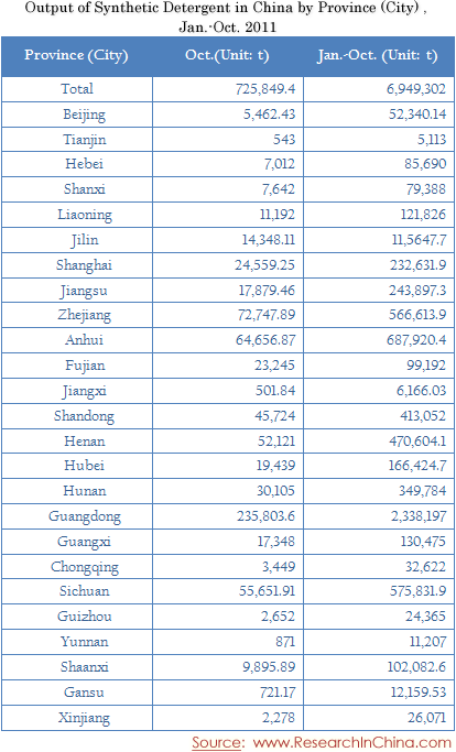 Output of Synthetic Detergent in China by Province (City) Jan.-Oct. 2011