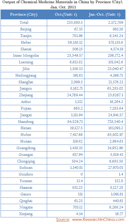 Output of Chemical Medicine Materials in China by Province (City) Jan.-Oct. 2011