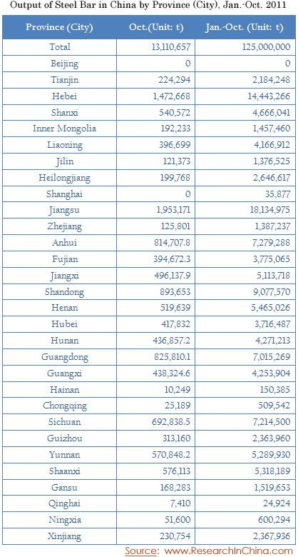 Output of Steel Bar in China by Province (City) Jan.-Oct. 2011