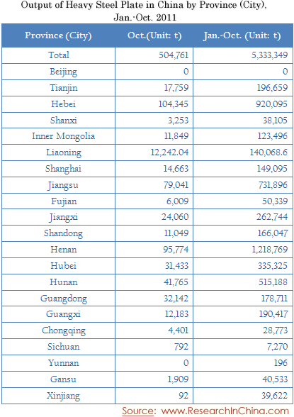Output of Heavy Steel Plate in China by Province (City) Jan.-Oct. 2011