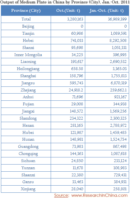 Output of Medium Plate in China by Province (City) Jan.-Oct. 2011