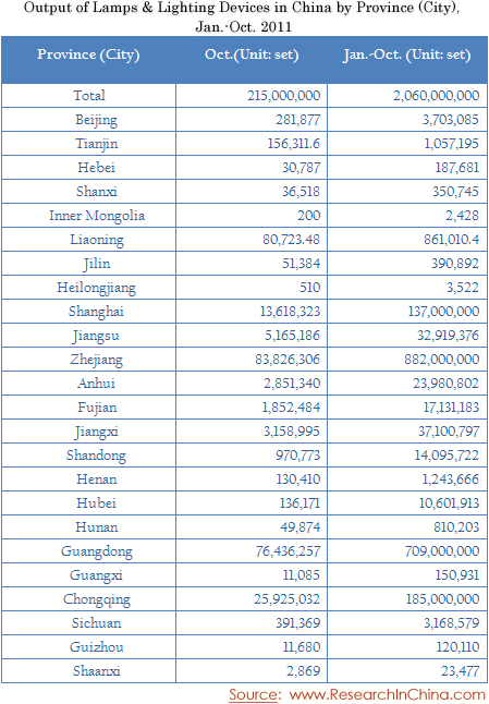 Output of Lamps & Lighting Devices in China by Province (City), Jan.-Oct. 2011