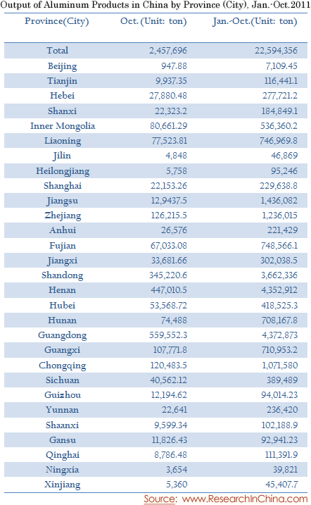 Output of Aluminum Products in China by Province (City), Jan.-Oct.2011