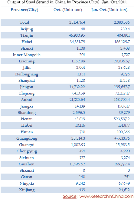 Output of Steel Strand in China by Province (City), Jan.-Oct.2011